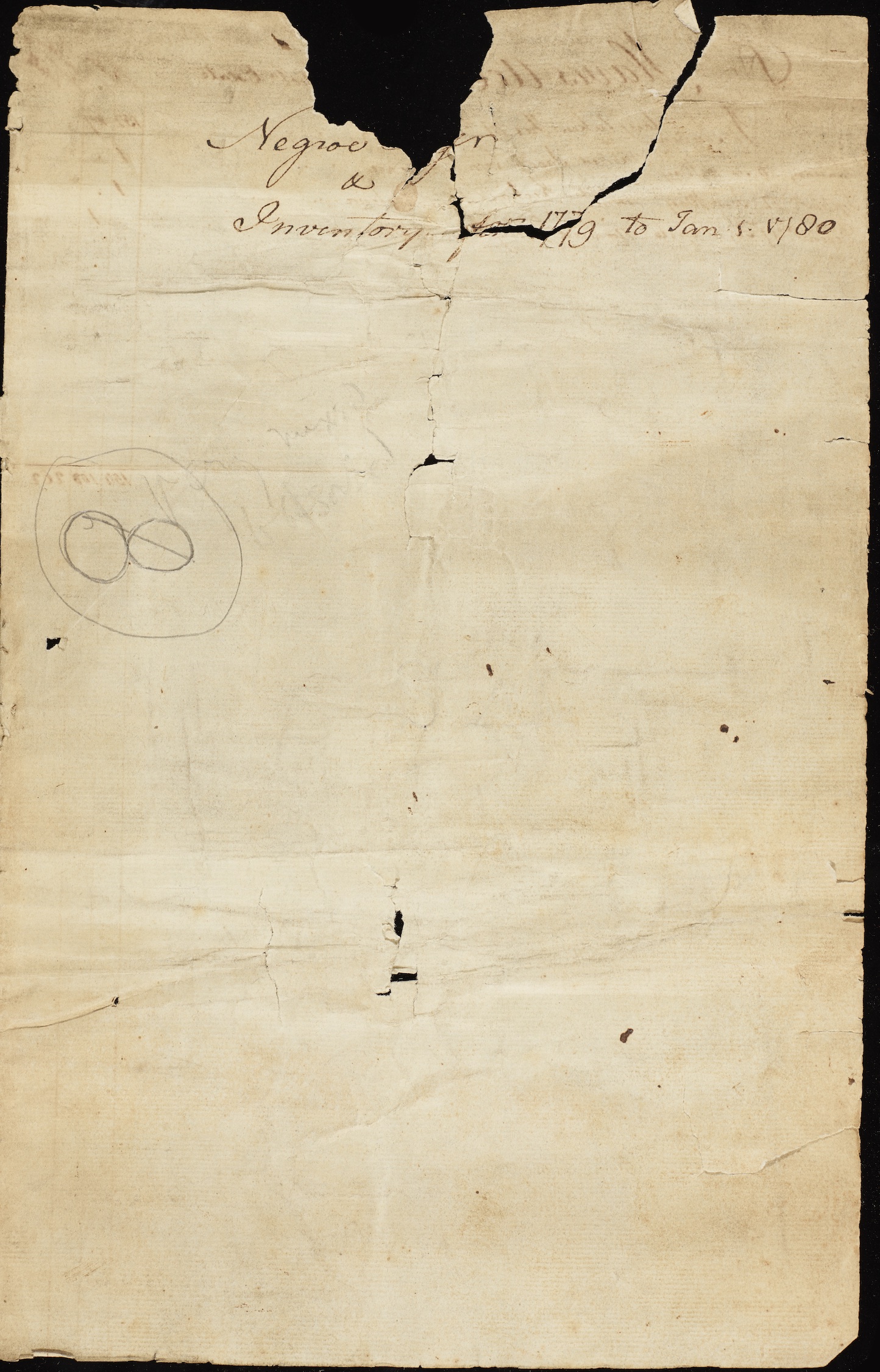 Document comprises a cover or title page (recto) and part of an inventory of enslaved people (verso) on Mesopotamia plantation, Jamaica, for the years 1779-80 on a single folio.