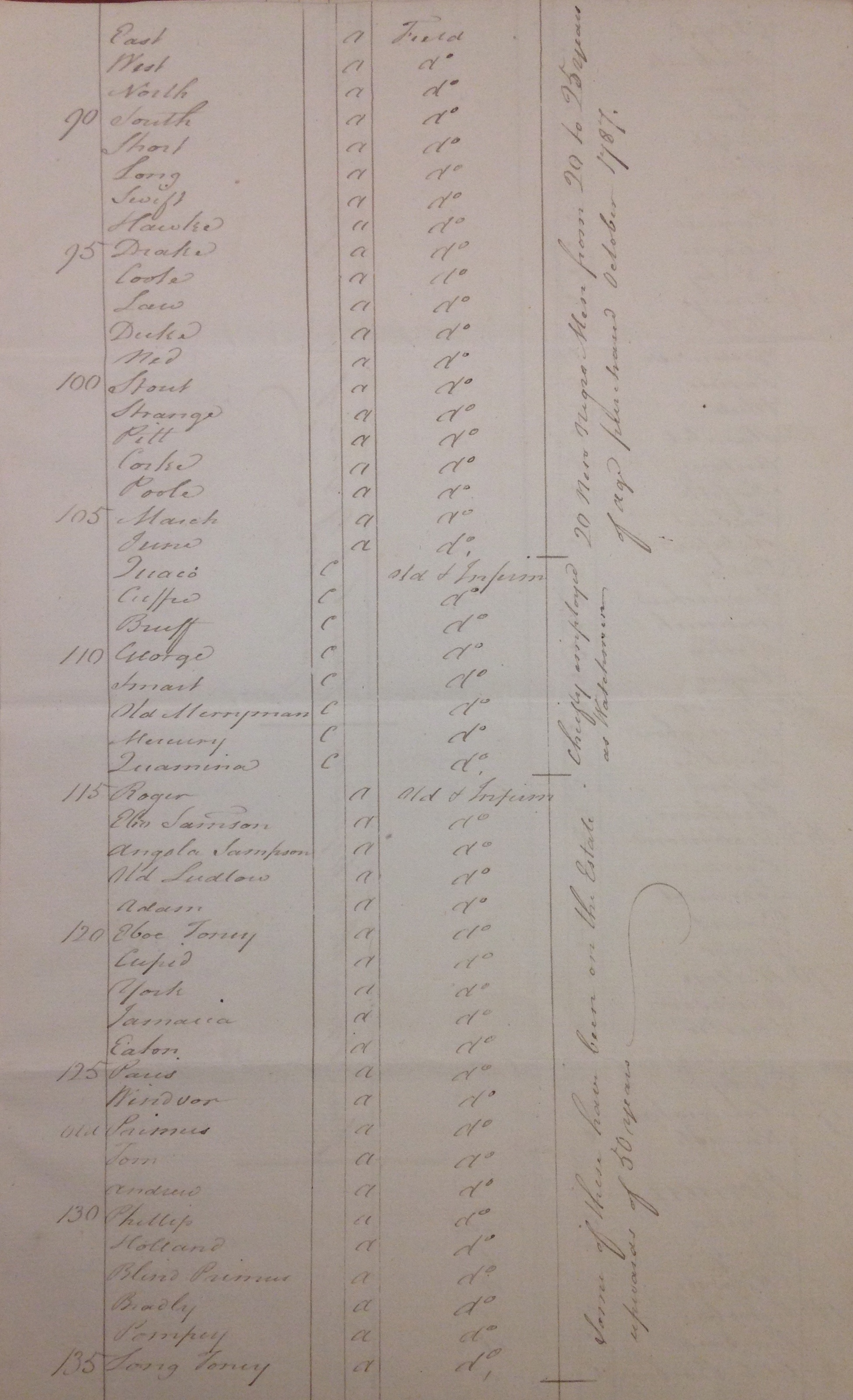 A list of enslaved people on Hope estate in 1788 with details of ages, parentage, occupation and general health, page 3 of 8. Source: 'A List of Negroes on Hope Plantation in Saint Andrew taken 1 January 1788', West Indies Box 1, folder 12, Stowe Papers, The Huntington Library, San Marino, California.