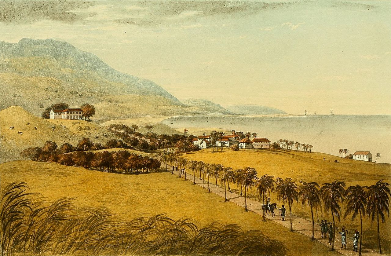 Romanticised portrayal of Spring Garden estate in St George, from James Hakewill's Picturesque tour of the island of Jamaica (1825). According to James Hakewill, "This plantation is contiguous to the sea-shore, and adjoins the left bank of the Spanish river. The mansion-house, or, according to local phraseology, the great house, is placed on a rising ground, and judiciously overlooks the works, which are extensive, and in the most complete repair; the mill is turned by a well-supplied water-wheel, and the boiling-house contains a double and single set of coppers. The overseer's house and offices, the hospital, and a building for the negro children, are severally large, and well adapted for their purposes. Between these and the great house, at the foot of the knoll on which the latter stands, is seen a portion of the negro village, which embraces, however, in its whole circuit an area of nearly thirty acres." See https://archive.org/details/picturesquetouro00hake.