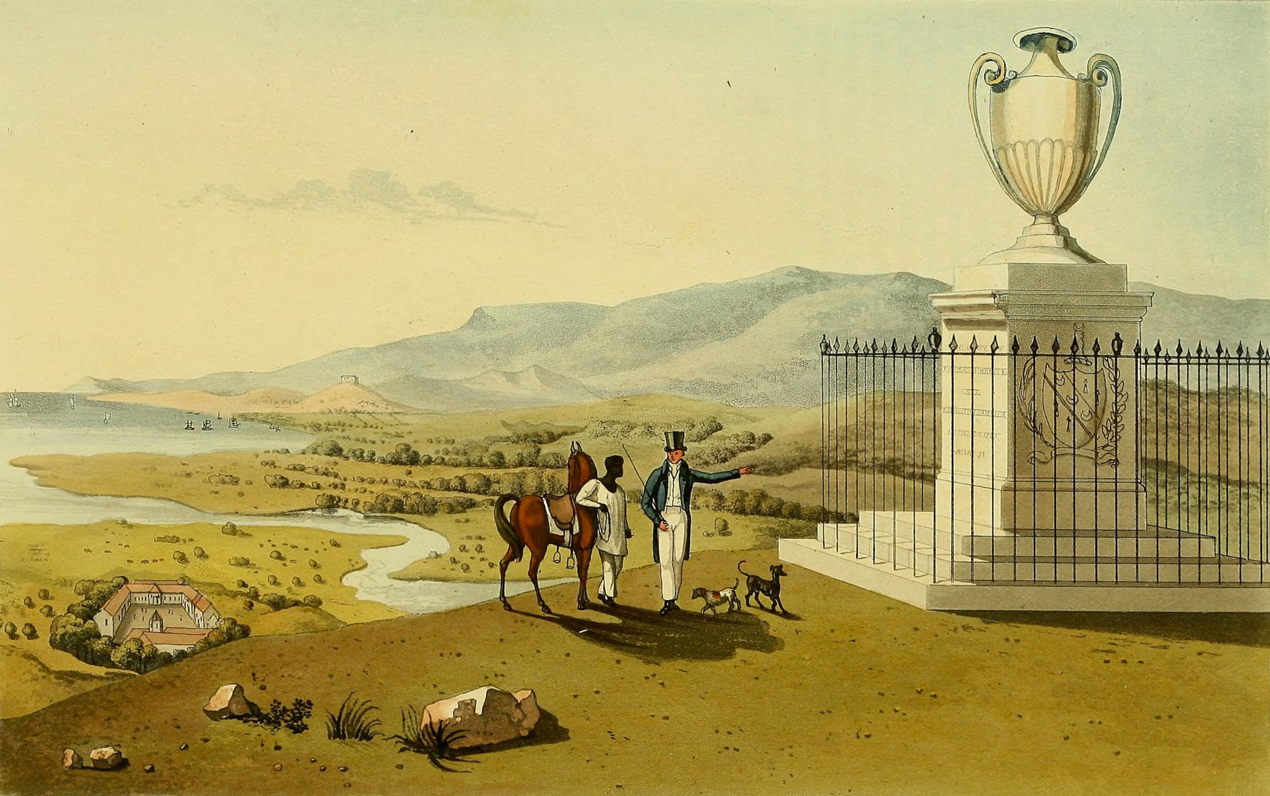 Monument of the late Thomas Hibbert, Esq. at Agualta Vale Penn, St Mary's, from James Hakewill's Picturesque tour of the island of Jamaica (1825). According to James Hakewill, "The annexed View represents the Monument of the late Thomas Hibbert, Esq., errected on the summit of an eminence, which besides the pleasure it gave to the proprietor in affording him a commanding view of the penn on which it is situated, and on either hand the works and cane fields of Agualta Vale and Orange Hill Sugar Estates, opened likewise to the south-east the buildings of the pen, and the winding course of the Agualta River immediately beneath his eye; onward, the beautiful sweeping line of Anotto Bay and Town, the buildings of Gibraltar and Gray Inn Estates, and the distant high lands of St George's. The plate before us embraces these interesting objects. On this spot, as having yeilded him many a happy moment, in the reflection of an amiable mind surveying his own creation of wealth and independence for a long inheritance, he desired that his remains should be placed. He died on the 20th of May 1780, aged 71 years." See https://archive.org/details/picturesquetouro00hake.