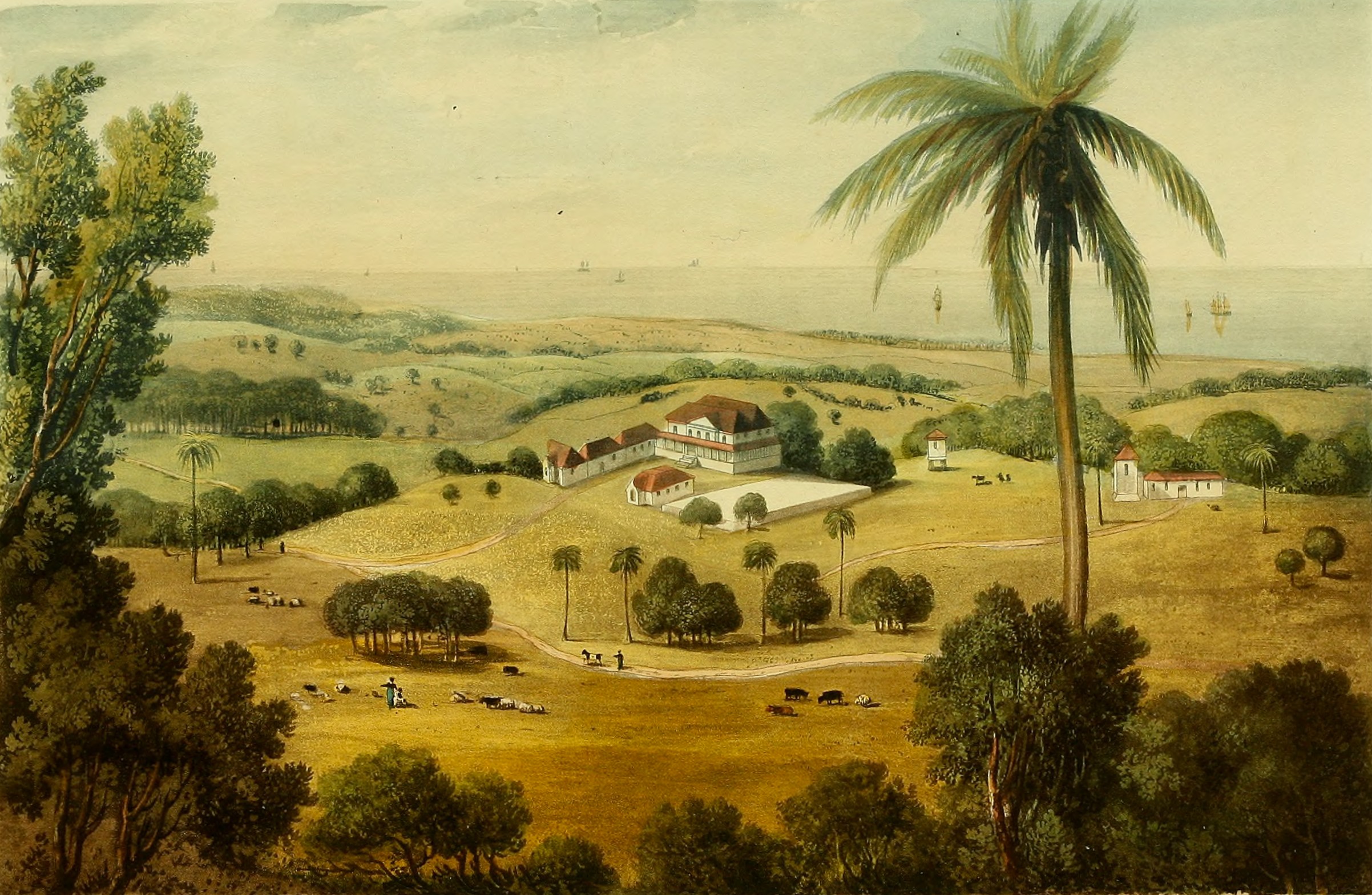 View of Cardiff Hall, St Ann, from James Hakewill's Picturesque tour of the island of Jamaica (1825). According to James Hakewill, "The annexed view is taken from the great interior road, and represents, seen through the Pimento Grove, the south or entrance front of the house. On the right is the barbecure, or plaister floor, on which the pimento is spread out to dry. The excellence of the house, the delightful variety of the grounds, and the contiguity to the sea, render Cardiff Hall one of the most desirable residences in the Island of Jamaica." See https://archive.org/details/picturesquetouro00hake.