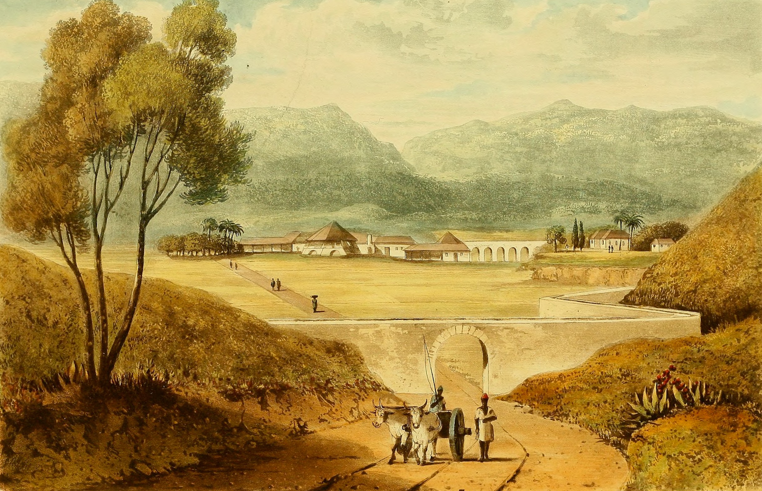 View of Whitney Estate, Clarendon, from James Hakewill's Picturesque tour of the island of Jamaica (1825). According to Hakewill, "The Plate before us gives the general view of the Estate in approaching it from the South. The road is crossed by the aqueduct, which conveys the water to the mill, and its course may be traced along the side of the hill to the works." See https://archive.org/details/picturesquetouro00hake.