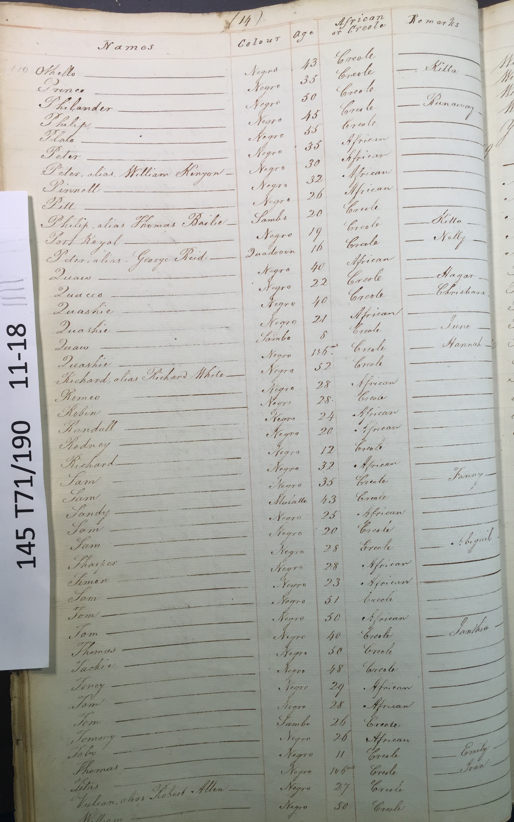 Slave register entry for Orange Cove estate in 1817, page 4 of 8. T71/190 pp. 11-18. © Images reproduced by permission of The National Archives, London, England. The National Archives give no warranty as to the accuracy, completeness or fitness for the purpose of the information provided. Images may be used only for purposes of research, private study or education. Applications for any other use should be made to The National Archives, Kew, Richmond, Surrey TW9 4DU, Tel: 020 8392 5225 Fax: 020 8392 5266.