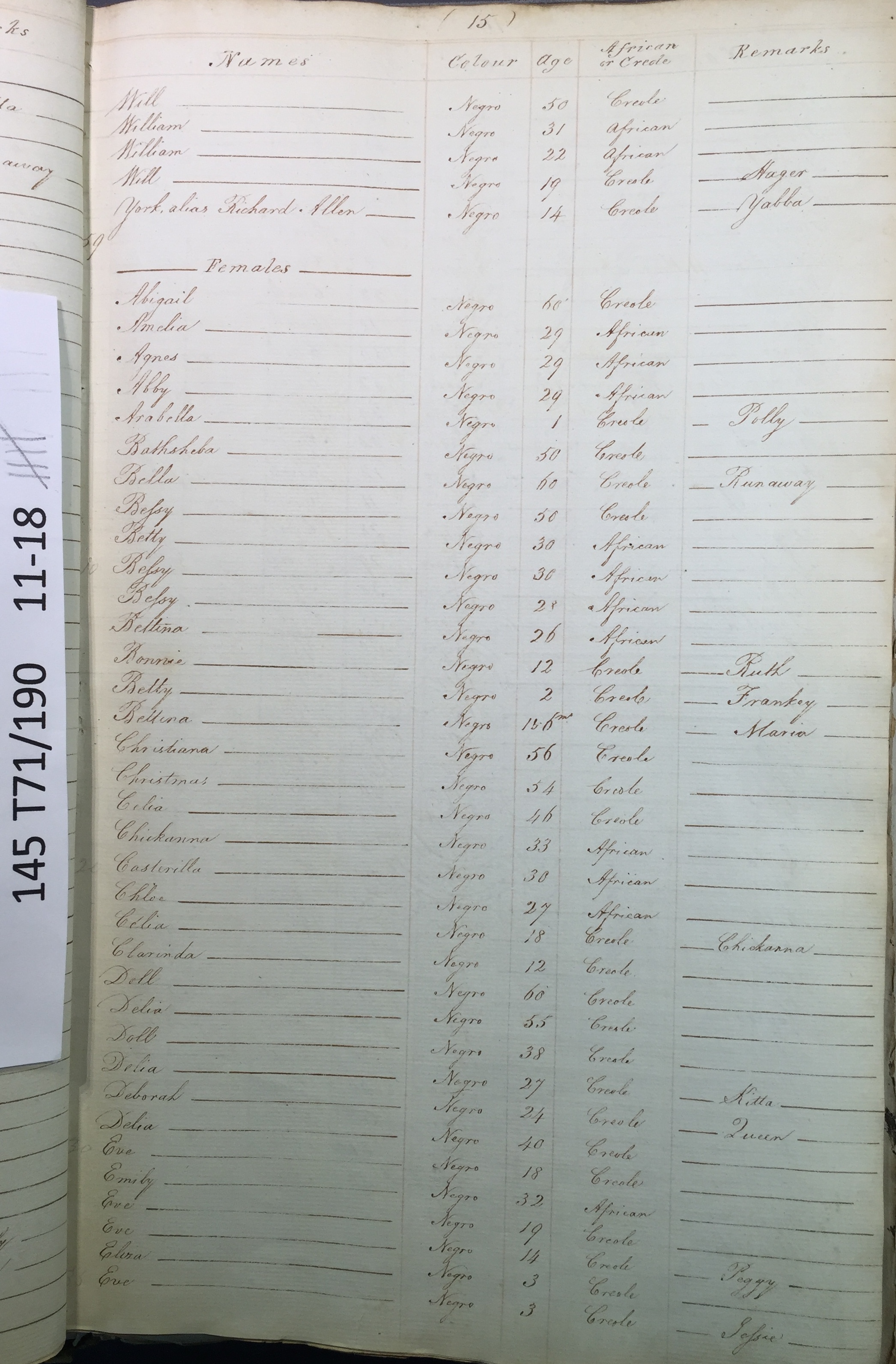 Slave register entry for Orange Cove estate in 1817, page 5 of 8. T71/190 pp. 11-18. © Images reproduced by permission of The National Archives, London, England. The National Archives give no warranty as to the accuracy, completeness or fitness for the purpose of the information provided. Images may be used only for purposes of research, private study or education. Applications for any other use should be made to The National Archives, Kew, Richmond, Surrey TW9 4DU, Tel: 020 8392 5225 Fax: 020 8392 5266.