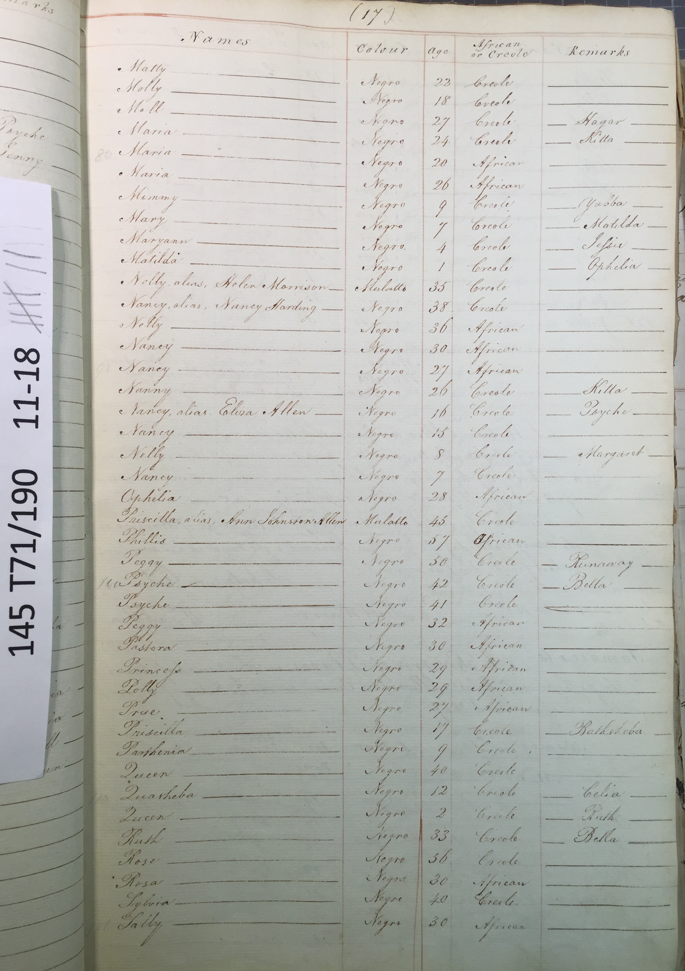 Slave register entry for Orange Cove estate in 1817, page 7 of 8. T71/190 pp. 11-18. © Images reproduced by permission of The National Archives, London, England. The National Archives give no warranty as to the accuracy, completeness or fitness for the purpose of the information provided. Images may be used only for purposes of research, private study or education. Applications for any other use should be made to The National Archives, Kew, Richmond, Surrey TW9 4DU, Tel: 020 8392 5225 Fax: 020 8392 5266.