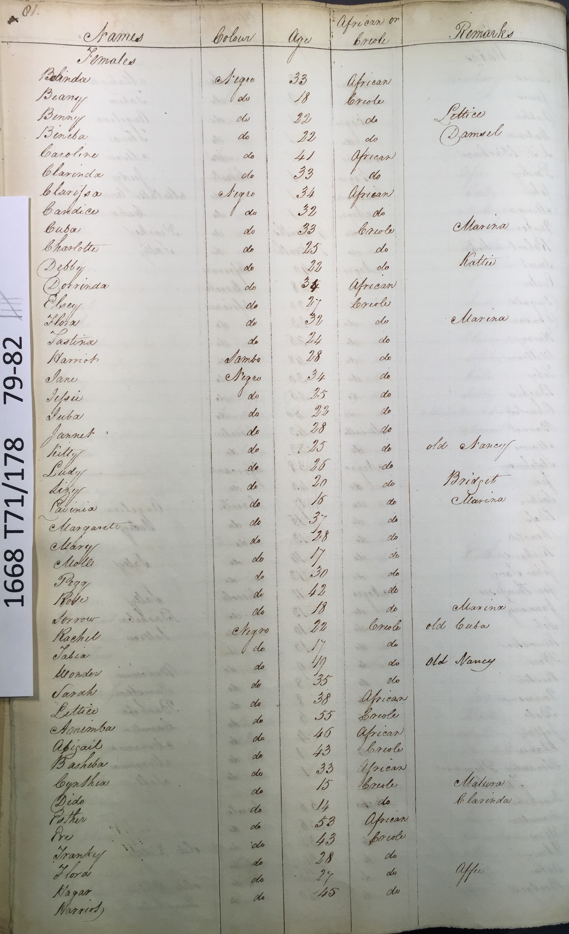 Slave register entry for Mesopotamia estate in 1817, page 5 of 8. T71/178 pp. 79-82. © Images reproduced by permission of The National Archives, London, England. The National Archives give no warranty as to the accuracy, completeness or fitness for the purpose of the information provided. Images may be used only for purposes of research, private study or education. Applications for any other use should be made to The National Archives, Kew, Richmond, Surrey TW9 4DU, Tel: 020 8392 5225 Fax: 020 8392 5266.