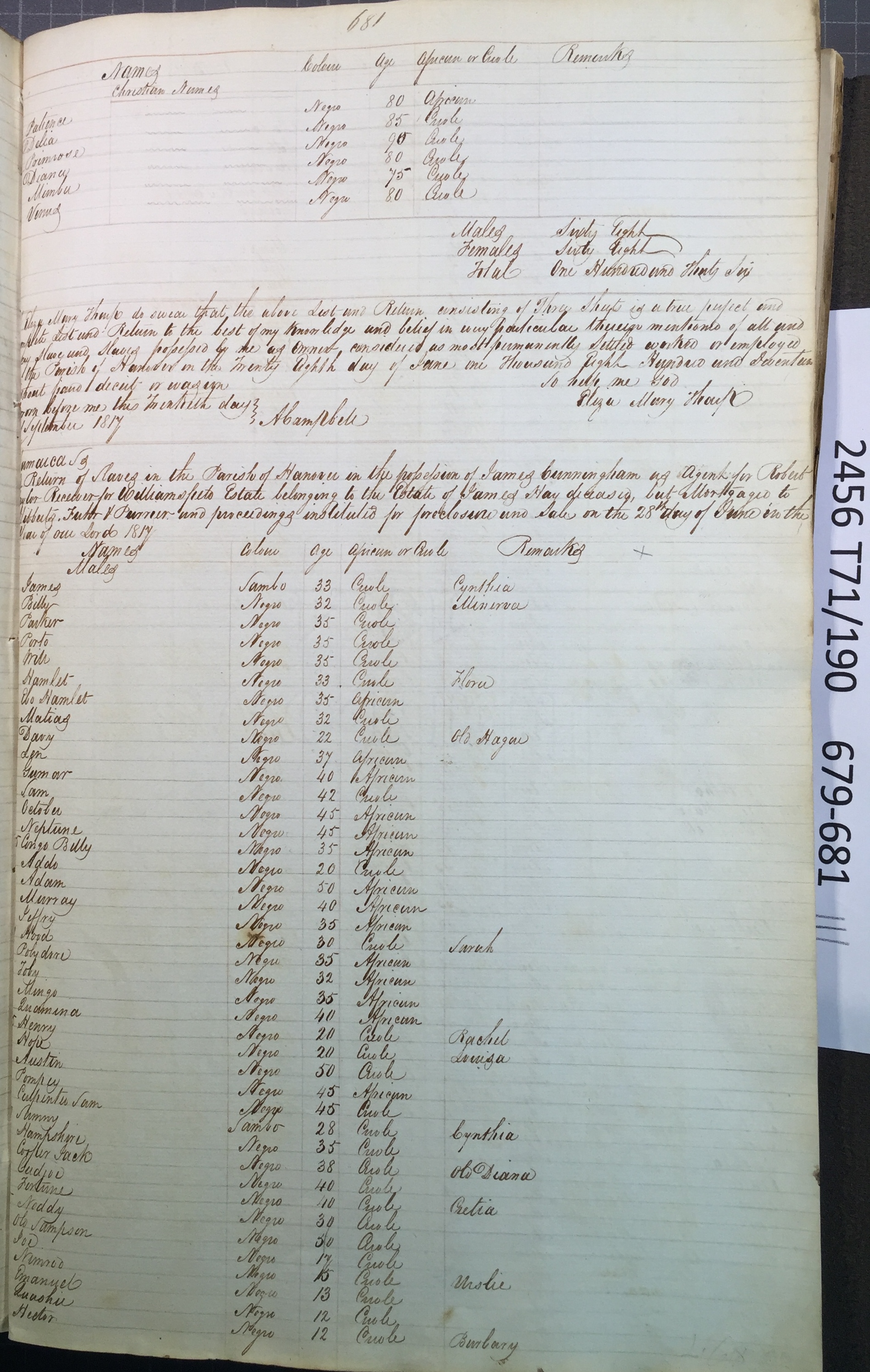 Slave register entry for Blue Hole estate in 1817, page 3 of 3. T71/190 pp. 679-681.