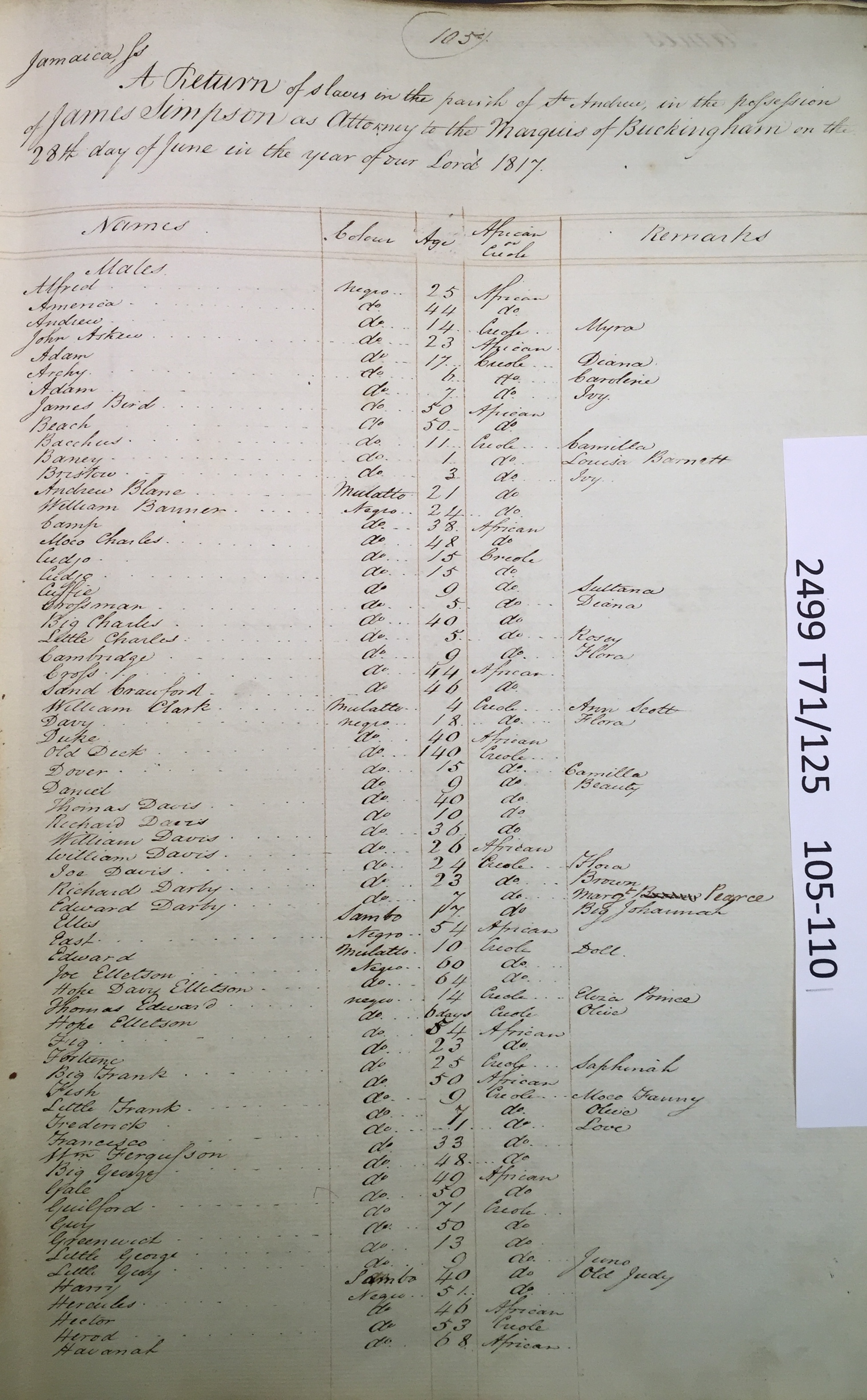 Slave register entry for Hope estate in 1817, page 1 of 6. T71/125 pp. 105-110. © Images reproduced by permission of The National Archives, London, England. The National Archives give no warranty as to the accuracy, completeness or fitness for the purpose of the information provided. Images may be used only for purposes of research, private study or education. Applications for any other use should be made to The National Archives, Kew, Richmond, Surrey TW9 4DU, Tel: 020 8392 5225 Fax: 020 8392 5266.