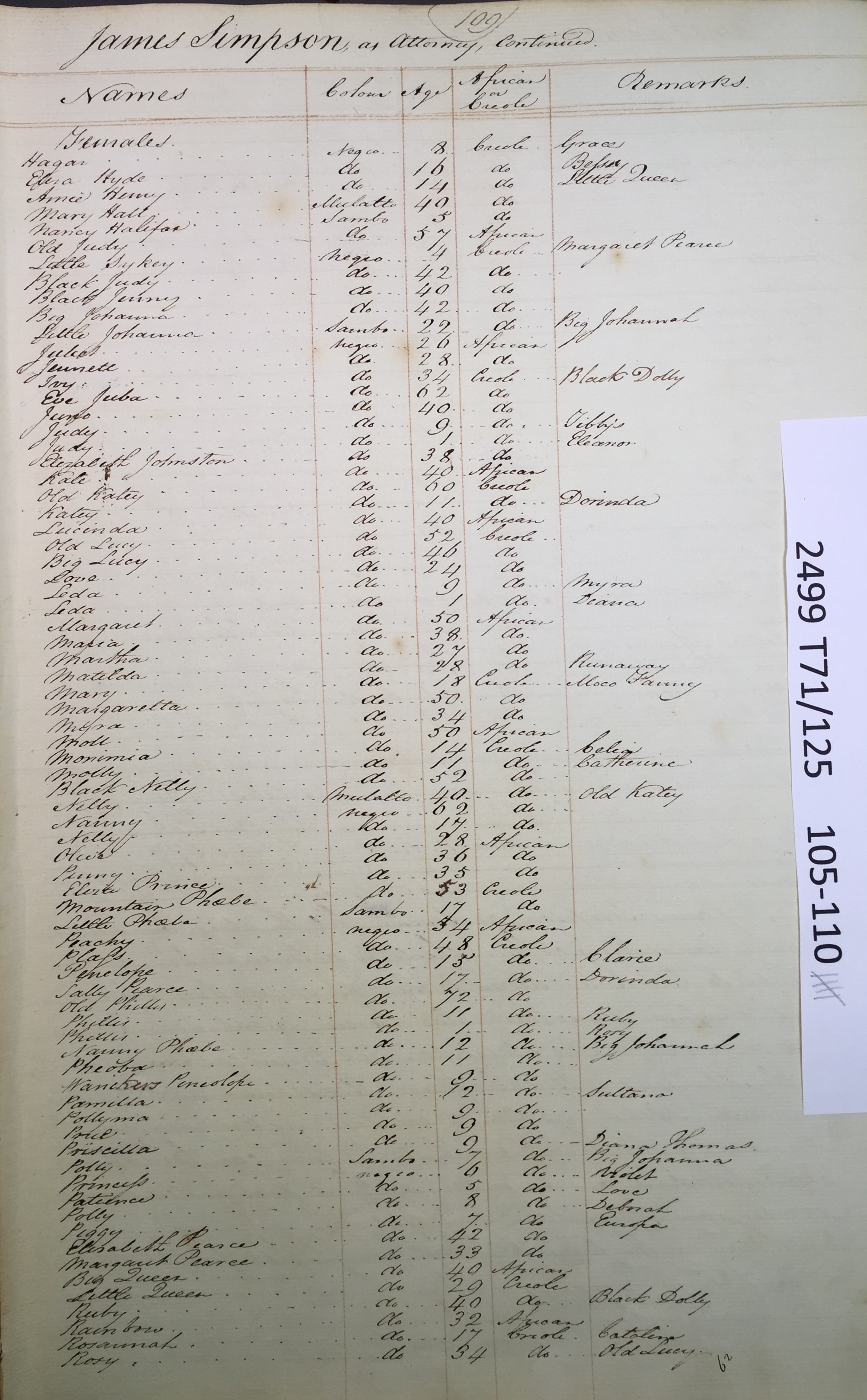 Slave register entry for Hope estate in 1817, page 5 of 6. T71/125 pp. 105-110. © Images reproduced by permission of The National Archives, London, England. The National Archives give no warranty as to the accuracy, completeness or fitness for the purpose of the information provided. Images may be used only for purposes of research, private study or education. Applications for any other use should be made to The National Archives, Kew, Richmond, Surrey TW9 4DU, Tel: 020 8392 5225 Fax: 020 8392 5266.