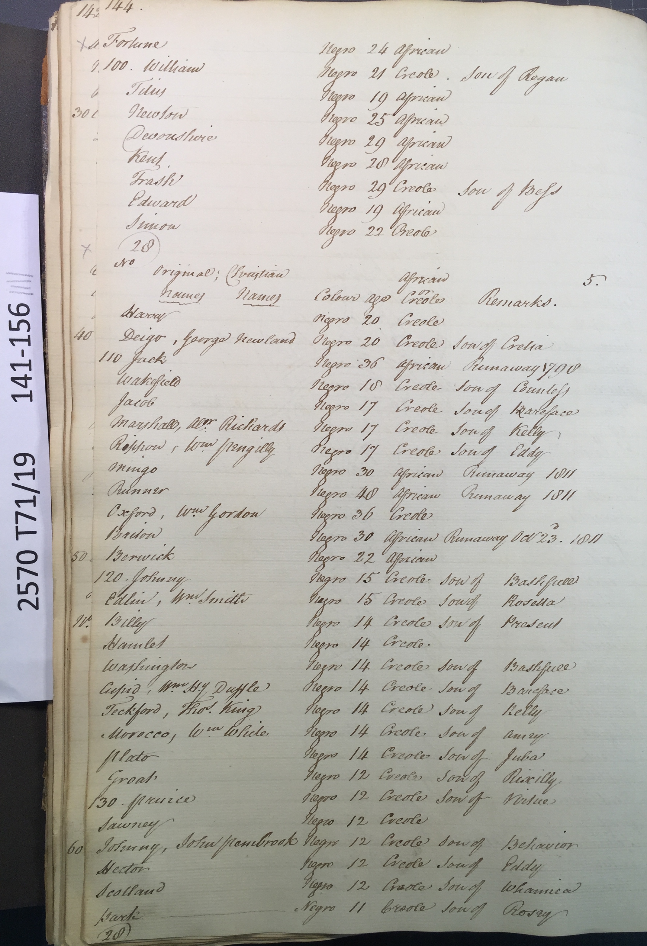 Slave register entry for Worthy Park estate in 1817, page 4 of 16. T71/19 pp. 141-156. © Images reproduced by permission of The National Archives, London, England. The National Archives give no warranty as to the accuracy, completeness or fitness for the purpose of the information provided. Images may be used only for purposes of research, private study or education. Applications for any other use should be made to The National Archives, Kew, Richmond, Surrey TW9 4DU, Tel: 020 8392 5225 Fax: 020 8392 5266.