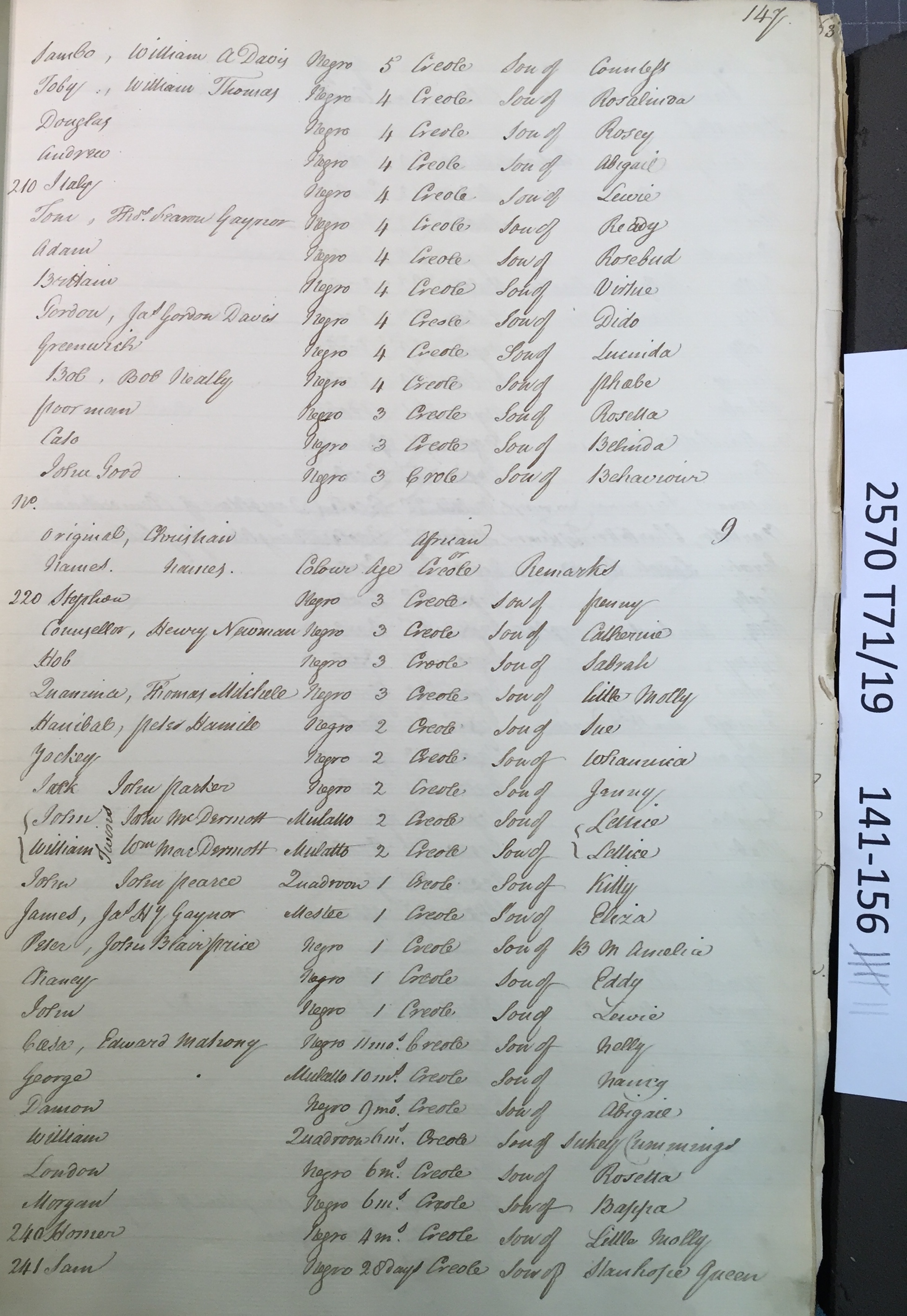 Slave register entry for Worthy Park estate in 1817, page 7 of 16. T71/19 pp. 141-156. © Images reproduced by permission of The National Archives, London, England. The National Archives give no warranty as to the accuracy, completeness or fitness for the purpose of the information provided. Images may be used only for purposes of research, private study or education. Applications for any other use should be made to The National Archives, Kew, Richmond, Surrey TW9 4DU, Tel: 020 8392 5225 Fax: 020 8392 5266.