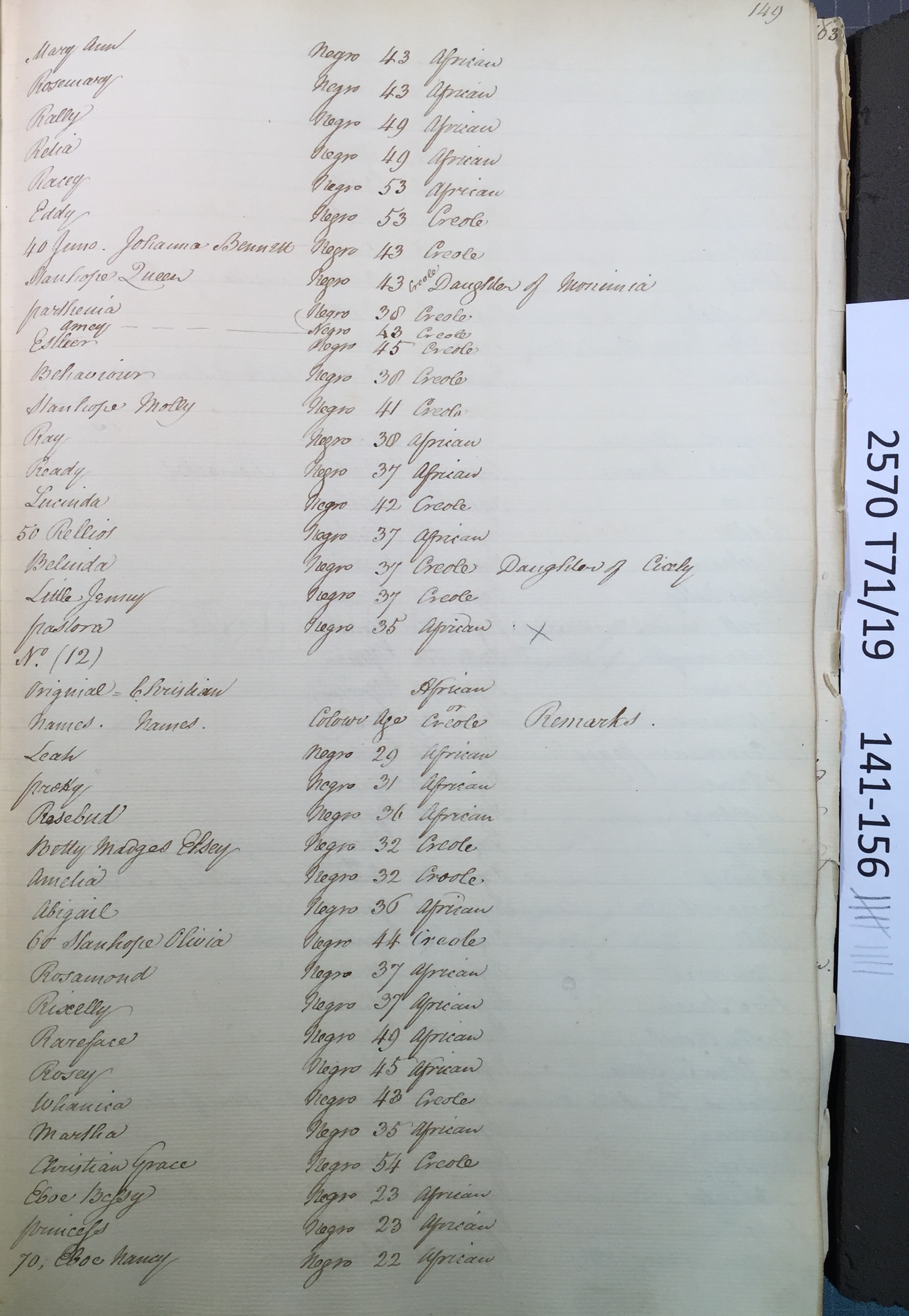 Slave register entry for Worthy Park estate in 1817, page 9 of 16. T71/19 pp. 141-156. © Images reproduced by permission of The National Archives, London, England. The National Archives give no warranty as to the accuracy, completeness or fitness for the purpose of the information provided. Images may be used only for purposes of research, private study or education. Applications for any other use should be made to The National Archives, Kew, Richmond, Surrey TW9 4DU, Tel: 020 8392 5225 Fax: 020 8392 5266.
