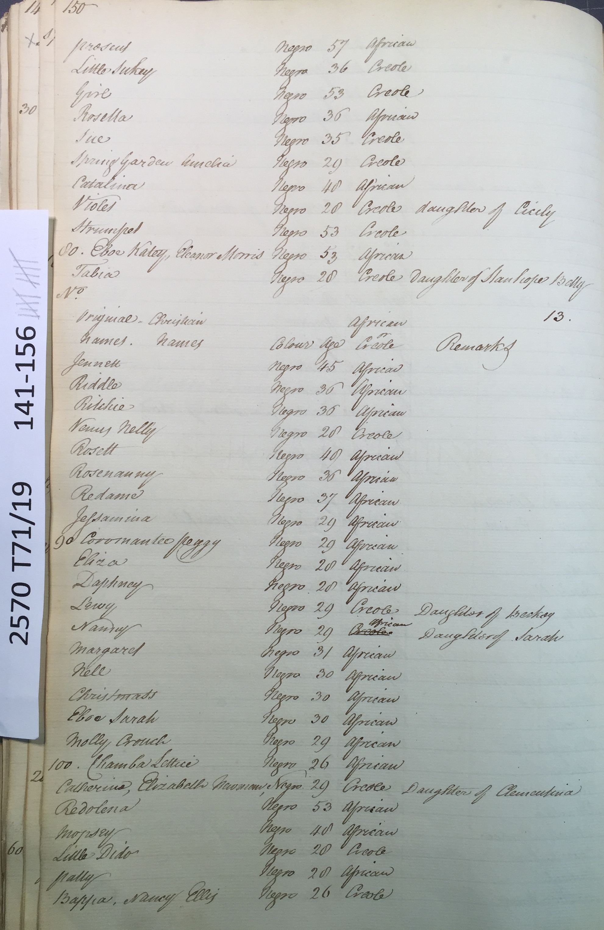 Slave register entry for Worthy Park estate in 1817, page 10 of 16. T71/19 pp. 141-156. © Images reproduced by permission of The National Archives, London, England. The National Archives give no warranty as to the accuracy, completeness or fitness for the purpose of the information provided. Images may be used only for purposes of research, private study or education. Applications for any other use should be made to The National Archives, Kew, Richmond, Surrey TW9 4DU, Tel: 020 8392 5225 Fax: 020 8392 5266.