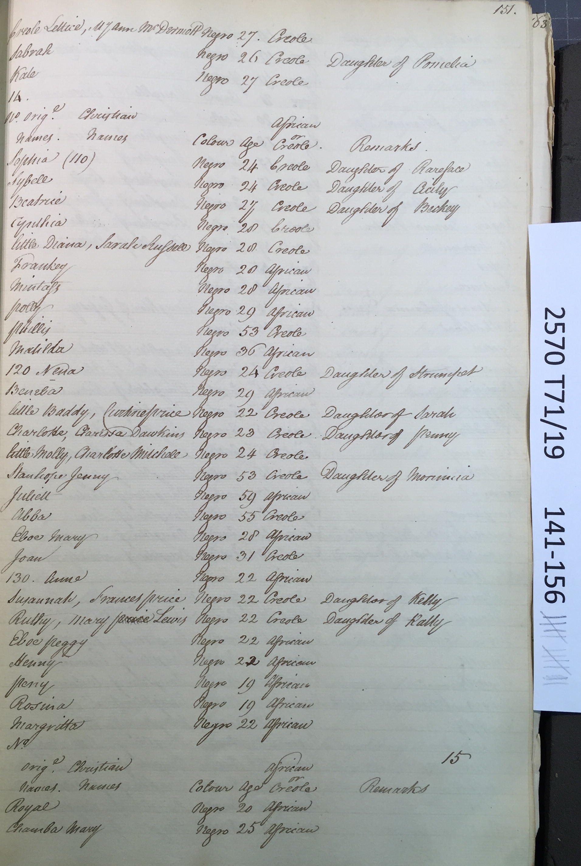 Slave register entry for Worthy Park estate in 1817, page 11 of 16. T71/19 pp. 141-156. © Images reproduced by permission of The National Archives, London, England. The National Archives give no warranty as to the accuracy, completeness or fitness for the purpose of the information provided. Images may be used only for purposes of research, private study or education. Applications for any other use should be made to The National Archives, Kew, Richmond, Surrey TW9 4DU, Tel: 020 8392 5225 Fax: 020 8392 5266.