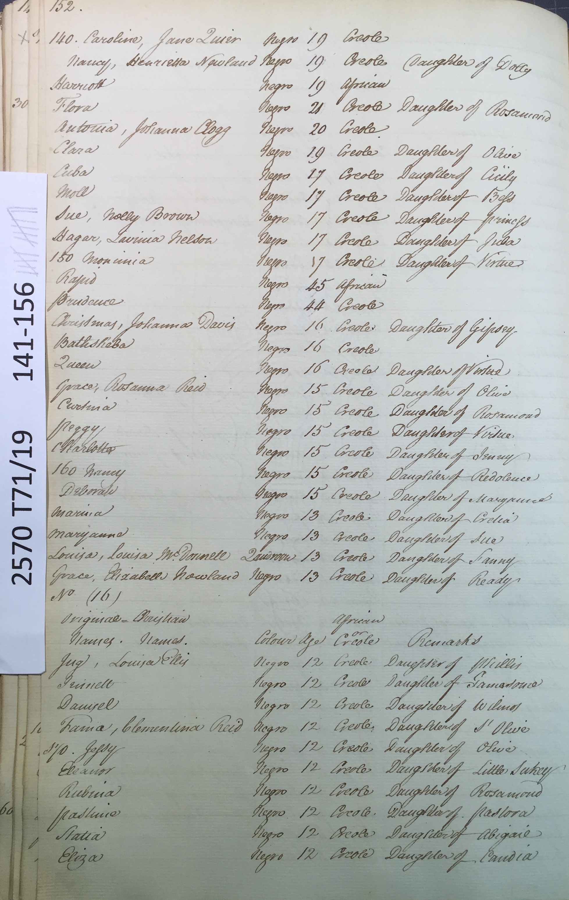 Slave register entry for Worthy Park estate in 1817, page 12 of 16. T71/19 pp. 141-156. © Images reproduced by permission of The National Archives, London, England. The National Archives give no warranty as to the accuracy, completeness or fitness for the purpose of the information provided. Images may be used only for purposes of research, private study or education. Applications for any other use should be made to The National Archives, Kew, Richmond, Surrey TW9 4DU, Tel: 020 8392 5225 Fax: 020 8392 5266.