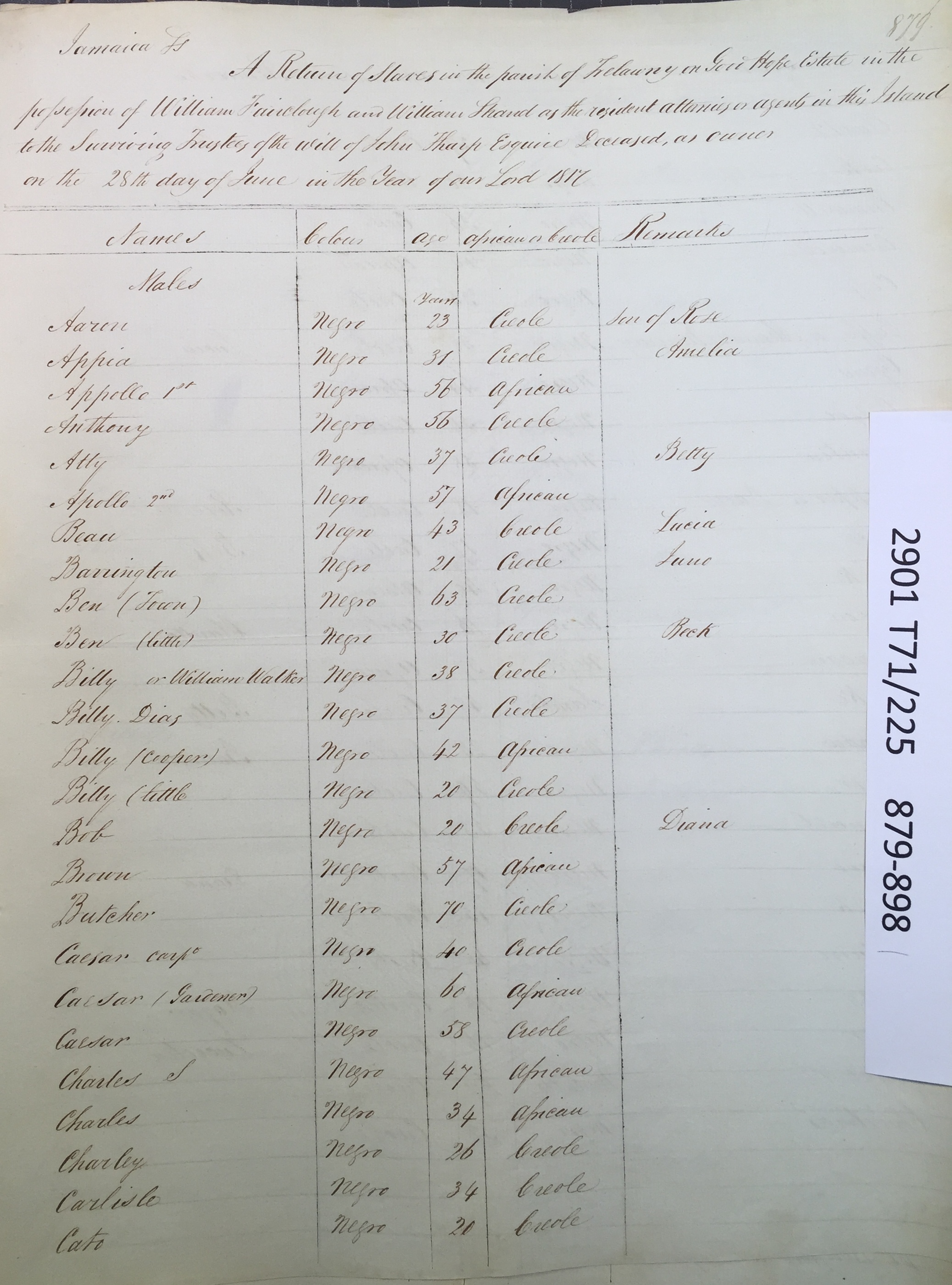 Slave register entry for Good Hope estate in 1817, page 1 of 19. T71/225 pp. 879-897. © Images reproduced by permission of The National Archives, London, England. The National Archives give no warranty as to the accuracy, completeness or fitness for the purpose of the information provided. Images may be used only for purposes of research, private study or education. Applications for any other use should be made to The National Archives, Kew, Richmond, Surrey TW9 4DU, Tel: 020 8392 5225 Fax: 020 8392 5266.