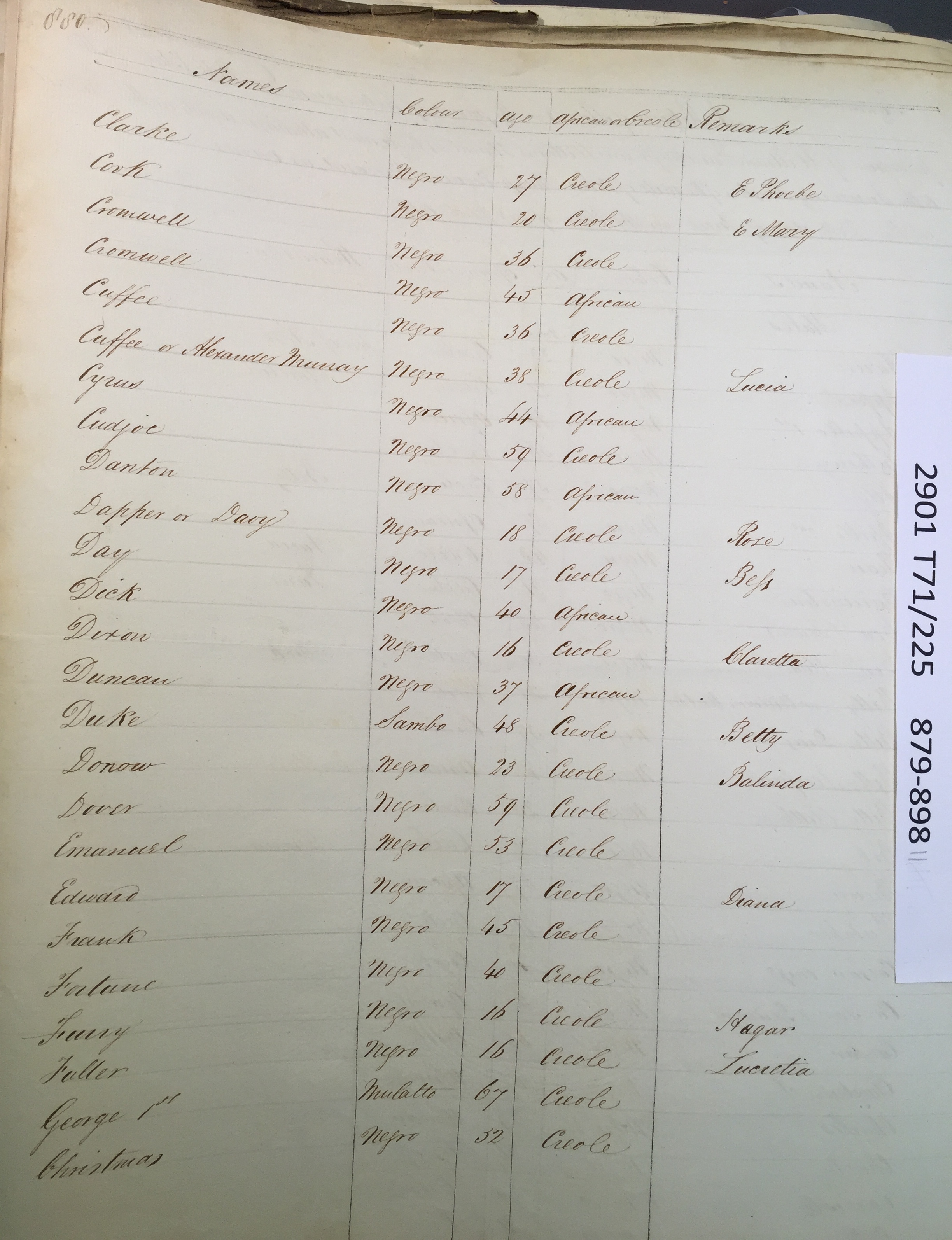 Slave register entry for Good Hope estate in 1817, page 2 of 19. T71/225 pp. 879-897. © Images reproduced by permission of The National Archives, London, England. The National Archives give no warranty as to the accuracy, completeness or fitness for the purpose of the information provided. Images may be used only for purposes of research, private study or education. Applications for any other use should be made to The National Archives, Kew, Richmond, Surrey TW9 4DU, Tel: 020 8392 5225 Fax: 020 8392 5266.