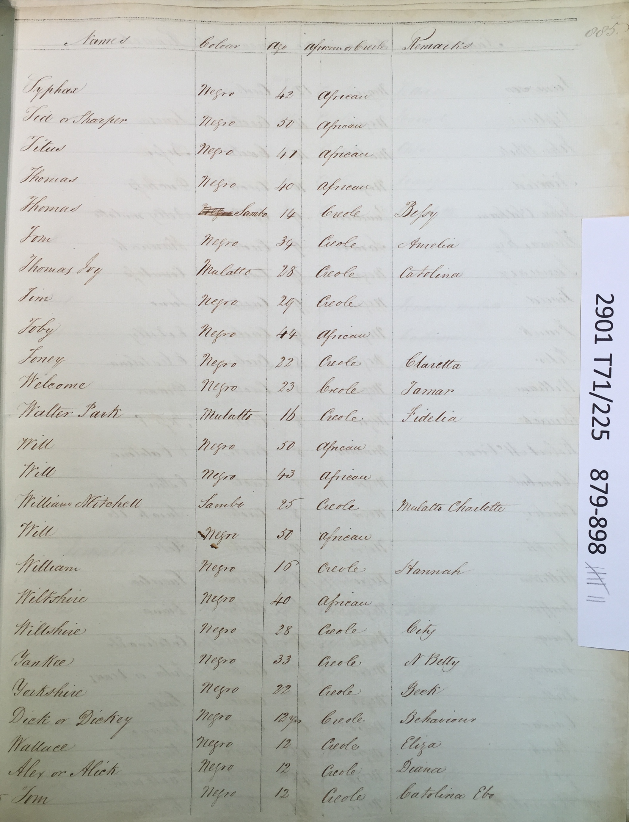 Slave register entry for Good Hope estate in 1817, page 7 of 19. T71/225 pp. 879-897. © Images reproduced by permission of The National Archives, London, England. The National Archives give no warranty as to the accuracy, completeness or fitness for the purpose of the information provided. Images may be used only for purposes of research, private study or education. Applications for any other use should be made to The National Archives, Kew, Richmond, Surrey TW9 4DU, Tel: 020 8392 5225 Fax: 020 8392 5266.