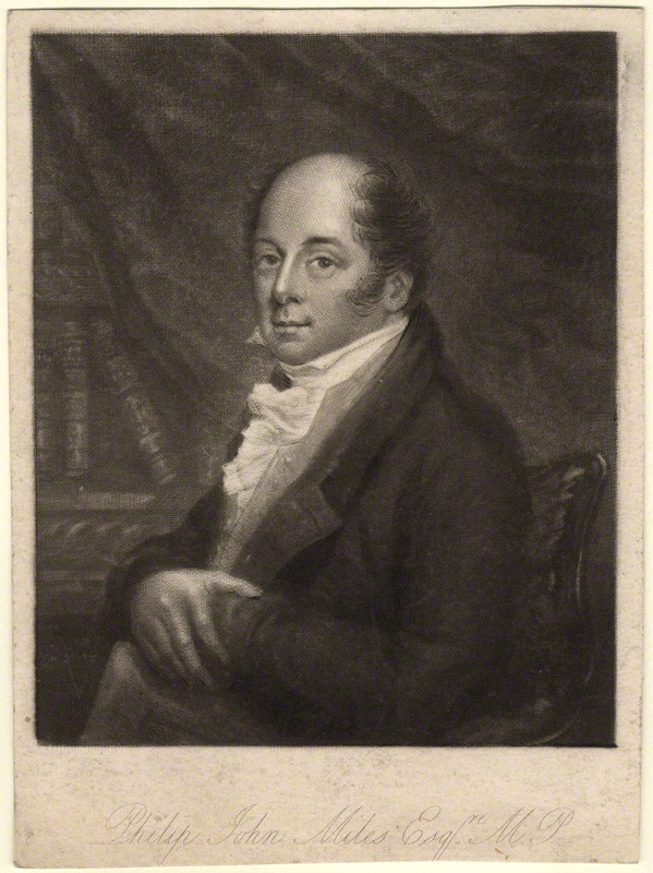 Married (1) Maria Whetham (?-22 June 1811) daughter of Very Rev. Arthur Whetham 1795; (2) Clarissa Peach (?-22 June 1868) (daughter of Samuel Peach Peach and Clarissa Partridge, and grand-daughter of Henry Cruger) 11/05/1813. Political dynasty included Philip John Miles's son by first marriage: Sir William Miles 1st bart., (13 May 1797-17 Jun 1878) MP for Chippenham 1818-20; New Romney 1830-32; East Somerset 1834-65); Sir William's son Sir Philip John William Miles 2nd bart. (1825-1888, Conservative MP for East Somerset 1878-1885). [For the latter's will, leaving personal estate of £12,125 8s 0d, proved 1888, see National Probate Calendar, 1888.] By his 2nd marriage, Philip William Skynner Miles (1816-1881), MP for Bristol 24 July 24 1837-7 July 1852. [Succeeded his father] [See separate entry for P. W. S. Miles]. His children were: With (1): Sarah Agatha; Elizabeth; Millicent; Agatha; Sir William, 1st Bt. (13 May 1797-17 Jun 1878). With (2): Philip William Skynner (1816-1881); Clara Philippa; J. W. (?-1878); George Frederick William; Ellen; Colonel Charles William; Sybilla Mary (?-24 Dec 1889); Marianne Adelaide; Robert Henry William (1818-1883); Edward Peach William (1829-1881).