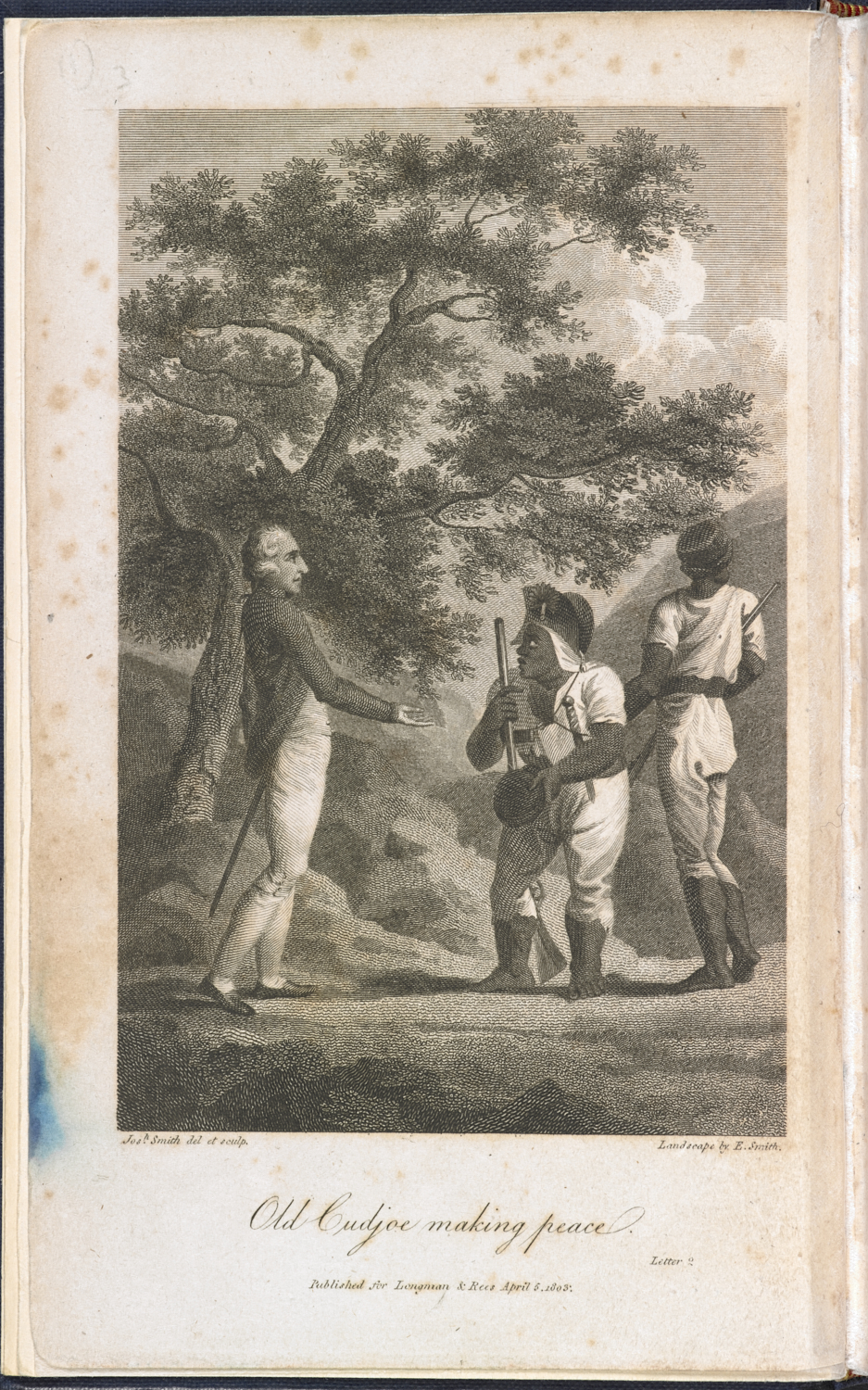 The image opposite is from 1803, depicting Guthrie negociating with Cudjoe in 1739. © British Library, public domain.