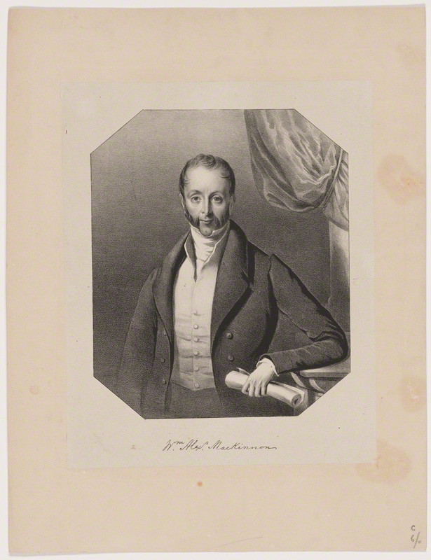 Politician (Tory MP) & Chief of clan Mackinnon; b. 2 August 1784 in Dauphiné, France; eldest son of William Mackinnon and his wife, Harriet, daughter of Francis Frye of Antigua. Daniel Mackinnon (1791-1836) was his younger brother [Note a]. Attended St John's College, Cambridge; graduated BA 1804, MA 1807; then a student of Lincoln's Inn, but was not called to the bar.